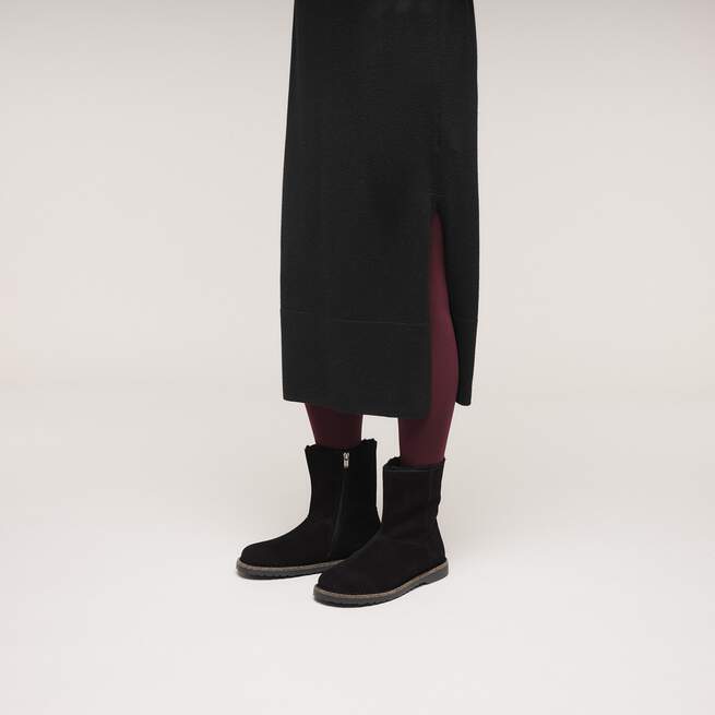 Black boot. Big comfort. The Birkenstock Uppsala Zip Shearling Boot in Black is the ultimate blend of sleek style and winter-ready functionality. Crafted from velvety black suede and lined with soft, breathable shearling, this boot delivers cozy warmth without compromising the minimalist design. The inside zip makes it easy to slip on and off, while the contoured cork-latex footbed provides all-day arch support that molds to your foot.