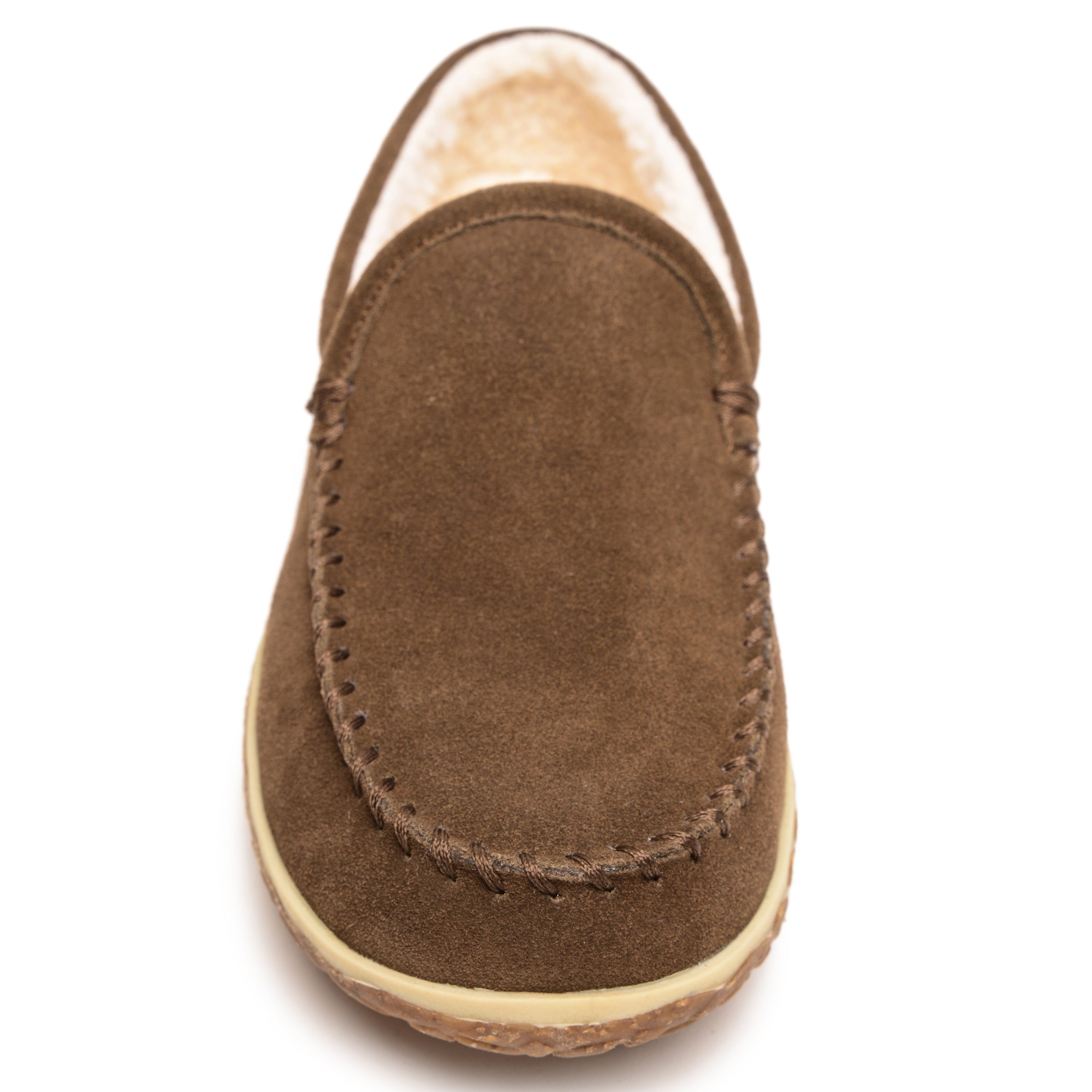 The Minnetonka Men’s Tilden in Autumn Brown takes classic moccasin style and makes it street-ready. Designed with a water-resistant suede upper, this versatile slipper keeps your feet protected while maintaining a rich, casual look. Inside, a cozy Berber lining provides warmth and comfort, making it perfect for lounging or heading out the door.