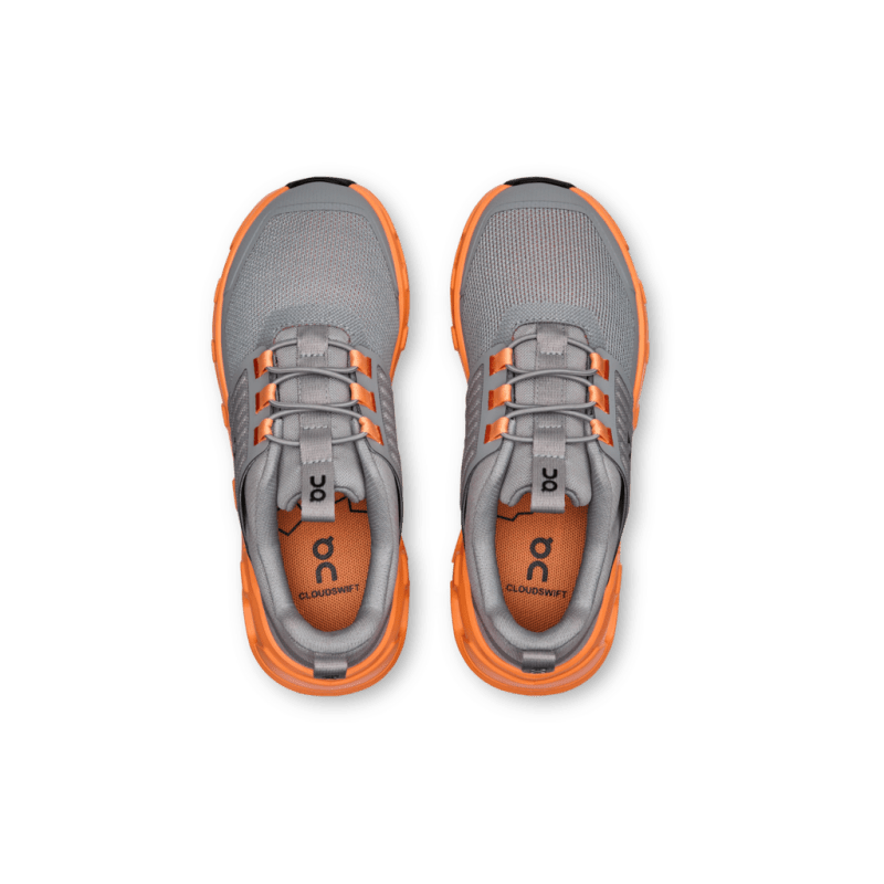 Big cushioning for little feet. The On Little Kids Cloudswift in Alloy/Tangerine delivers adult-level performance in a kid-sized package. Designed for active young explorers, this sneaker takes the comfort and technology of the Cloudswift 4 and adapts it for little ones—with soft cushioning, breathable materials, and a secure, easy-on fit.