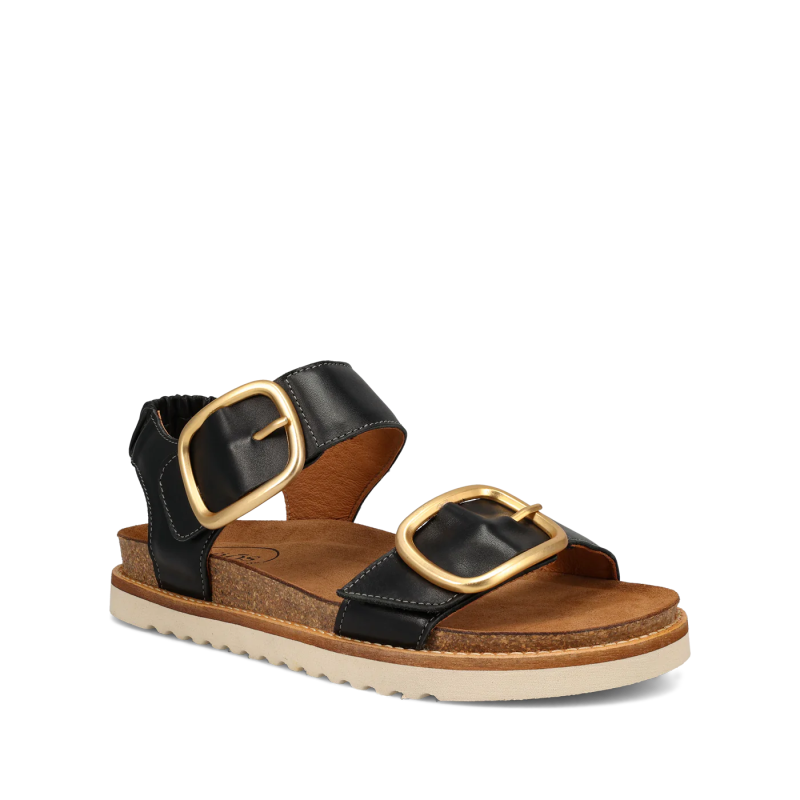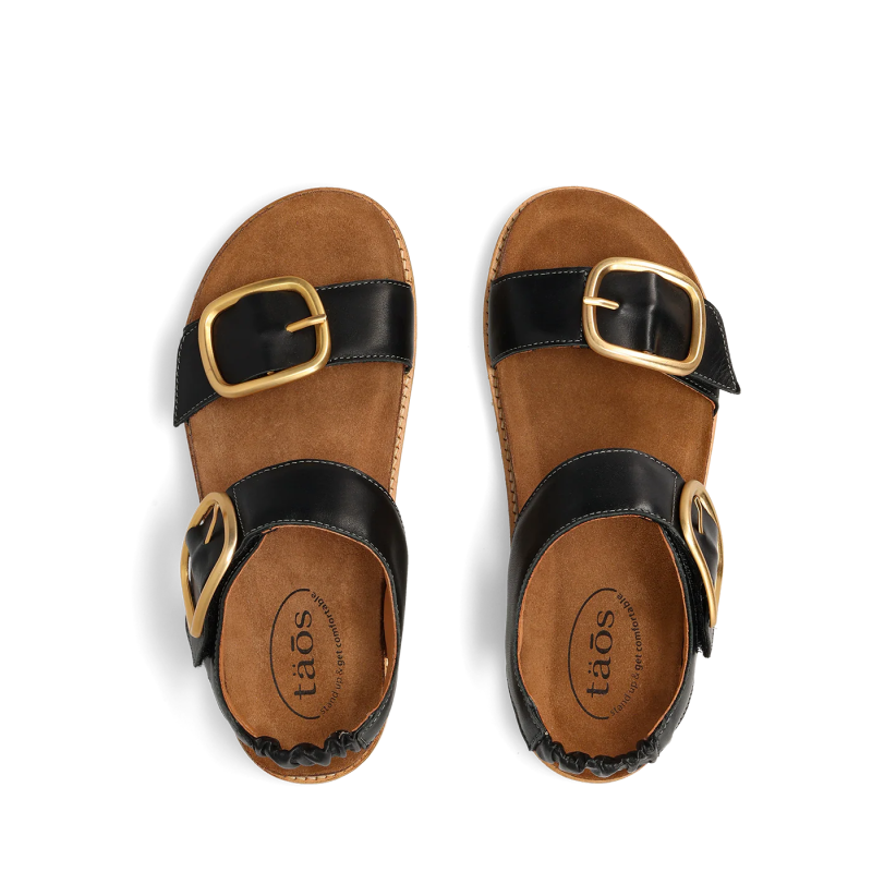 The sleek black leather upper features oversized gold-tone buckles that make a subtle statement without sacrificing everyday wearability. Beneath the style lies Taos’ signature arch and metatarsal support, delivered through a plush PU footbed lined with soft suede for instant comfort and all-day ease. The natural cork-latex midsole provides gentle flexibility and shock absorption, while forefoot cushioning helps reduce pressure during long days on your feet.